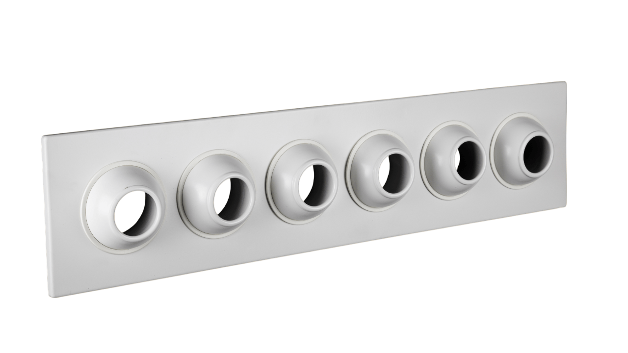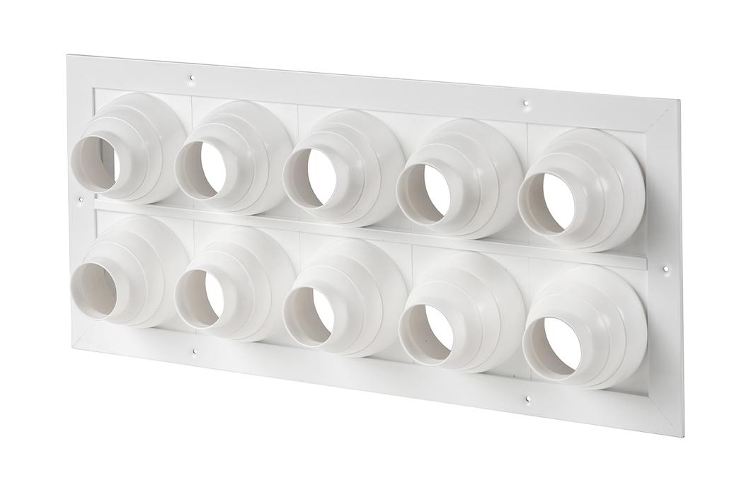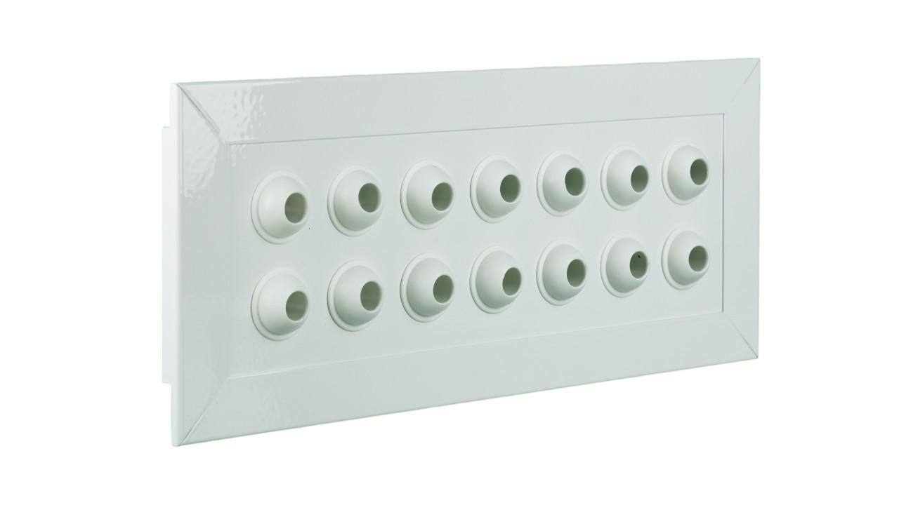 Long-range multi-nozzles consisting of aluminium nozzles with a 30° tilt and adjustable in all directions. Finished in white lacquered aluminium or RAL lacquered on request.